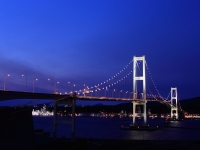 右と左の写真は鍋島山からの撮影です。山からの景色は、時間が経つと手前の木々が成長して視界が狭くなることが多いのですが、 今回行ってみたら手前の木々が伐採され、視界が確保されていました。白鳥大橋の奥に見える工場の煙突が明るくライトアップ されていました。この角度だと橋に近いので、ライトアップはない方が良かったです。真ん中の写真は橋の近くからです。