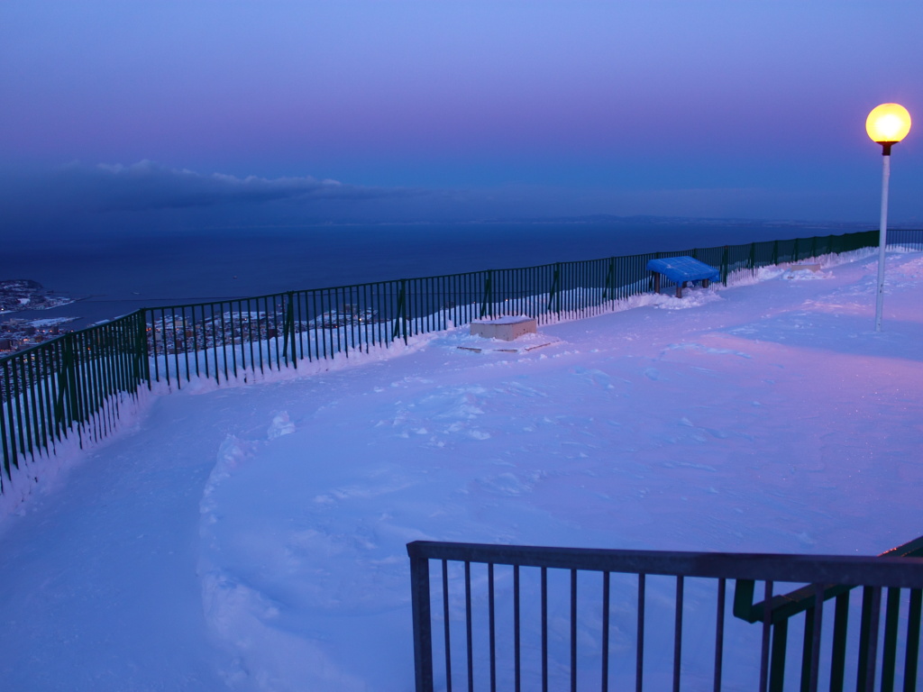 この時期は日が長く、日本海に夕陽が落ちたのは20時前後のようでした。ロープウェイ駅 では「北海道3大夜景」と謳ってあったようですが、それにふさわしい綺麗な夜景を 見ることが出来ました。札幌藻岩山や函館山に比べると観光客が少なく、撮影しやすかった です。視覚的には、真っ暗な方が市街地の光が際だつのに比べて、写真ではダークブルーの 空の方が見栄えがするように思えます。