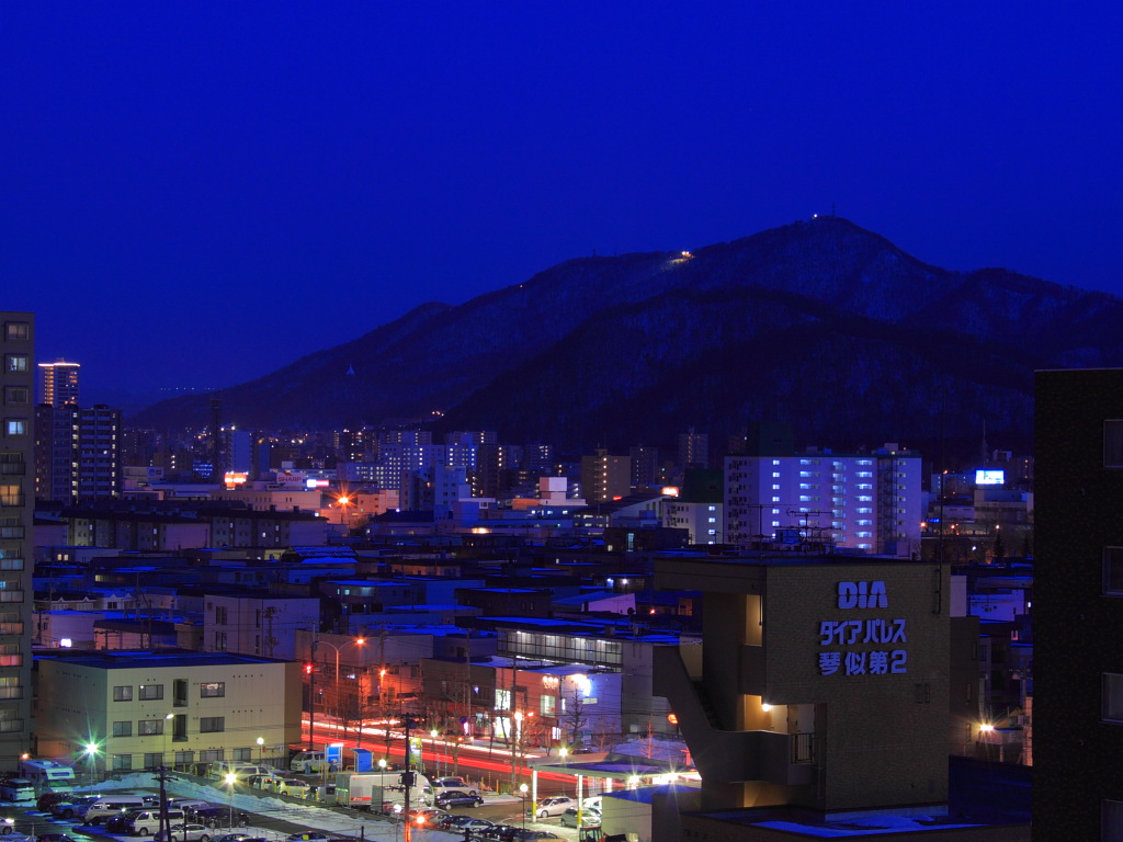JR琴似駅と地下鉄琴似駅との間にあるホテルヤマチからの風景です。左と真ん中の写真に写っている山が 藻岩山です。頂上の明かりが展望台。今年4月から少なくとも1年間は休業とのこと。夜景ファンには 残念な休業です。