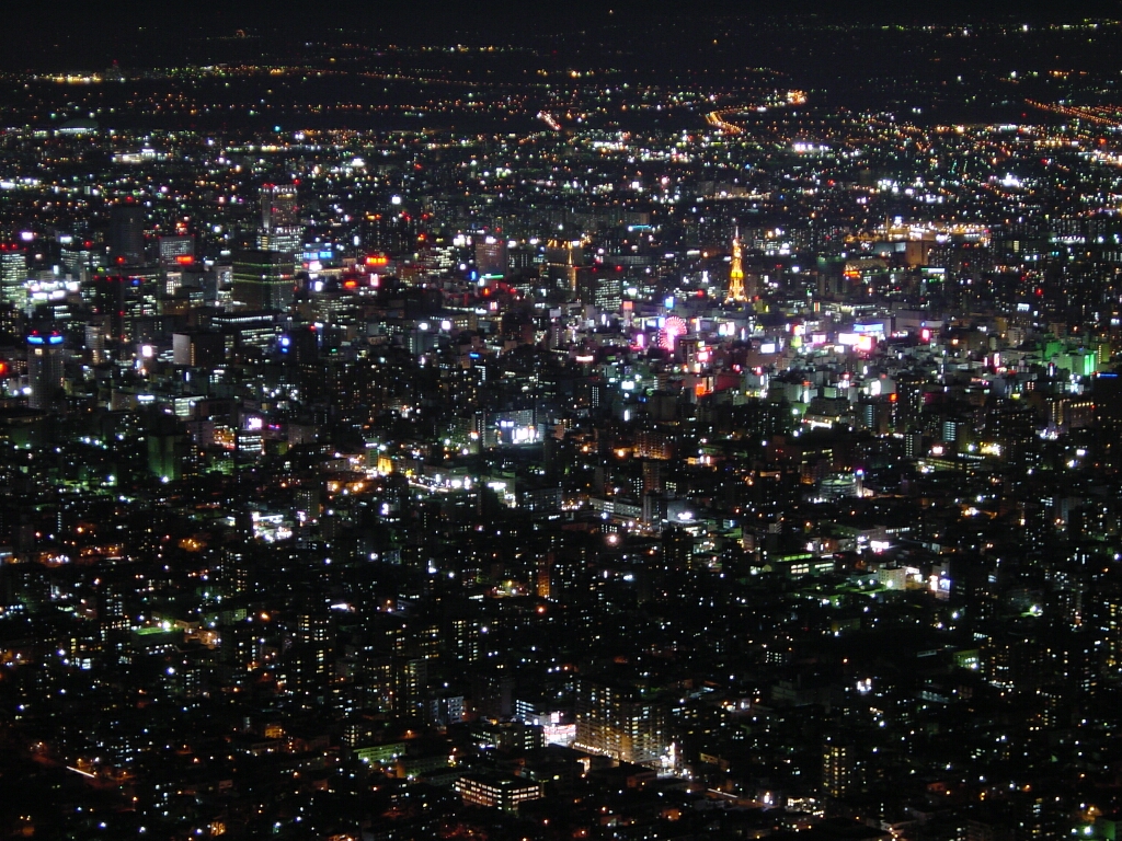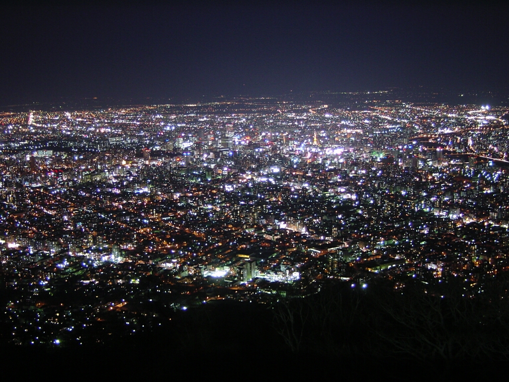 昨年初めて登り感動した藻岩山からの夜景。前回は夏だったためか少しもやがかっていましたので、今年は 春の晴天の日を選び、もう一度行ってきました。通勤時のコートはもうやめていましたが、山の上はまだ 寒く冷たい風が強く吹いていました。観光客はまだ少ない分撮影はしやすく、木々の葉っぱもこれからなので 市街地のビル明かりを満足に撮ることができました。すすきのの中心部にはオープンしたての観覧車が 見えました。