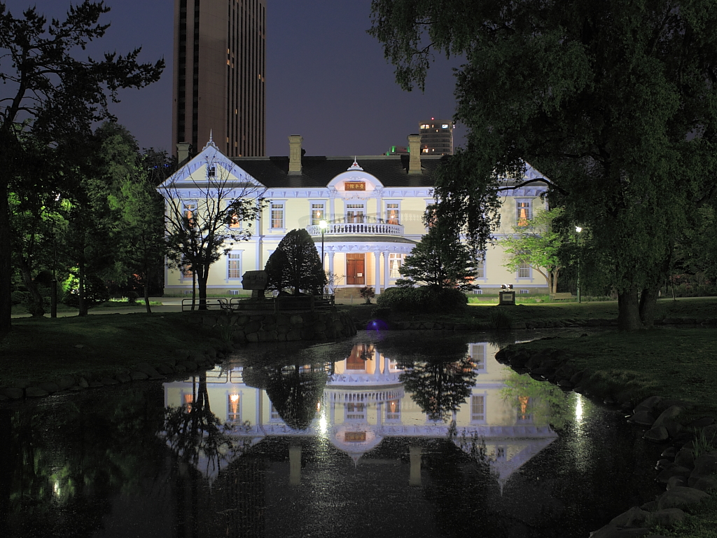 札幌のさわやかな夏が遠く過ぎ去り、冬の足音が聞こえてきました。撮影していると、 手が冷たくて、ポケットに入れたくなります。きっと豊平館は夜にライトアップしている だろうと思い、行ってみたら予想通りでした。個人的に豊平館の色・形が好きです。 昼間は建物の中に入れます。結婚式の会場としても使われています。この日は、ミニ 三脚を持って行ったので、写真は全て地面より約10cmの高さで撮影したものです。