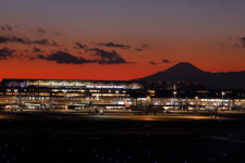 羽田空港国内線ターミナル展望デッキの写真です。JALの方です。富士山も見えますが、春が近いので 霞んでいます。