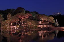 文京区駒込の六義園です。毎年紅葉の時期にライトアップイベントが開催されています。夕暮れ時は大変な人混みで、 園内の細い道は混雑していました。ほとんどの見物人は「きれいだね〜」と言っていましたが、まれに「全然きれい じゃない」と言う人もいました。水の映り込みが鏡のようですが、カモたちが遊んでいると波が立って映りが悪く なってしまいます。
