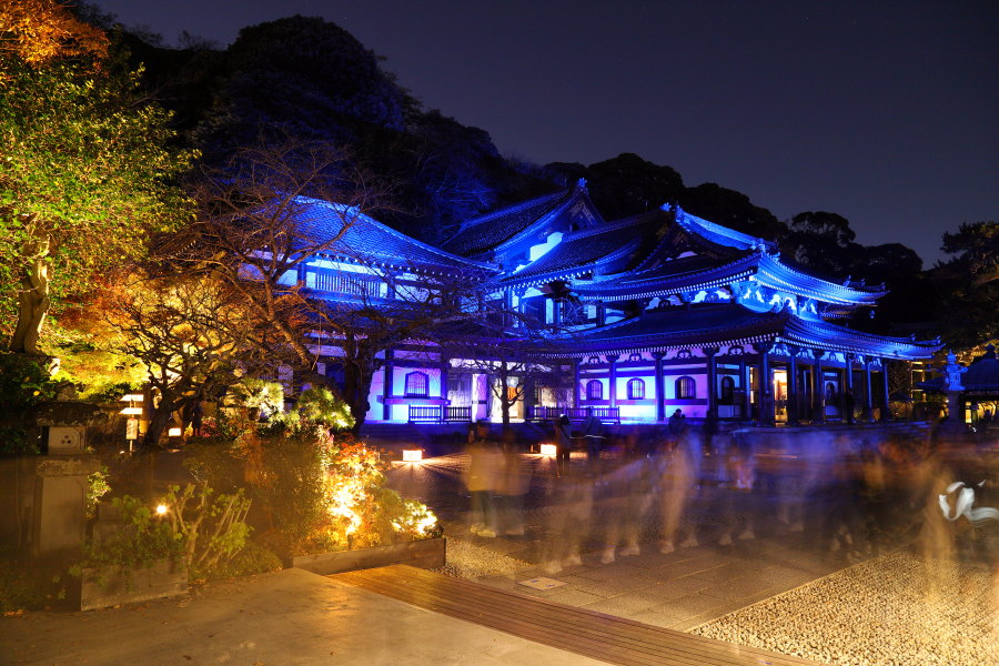 鎌倉駅から徒歩10分くらいの所にある鶴岡八幡宮です。昼間は観光客でにぎわっていますが、深夜・早朝は 地元の人が散歩している程度です。一番奥にある本宮は夜通しライトアップされています。