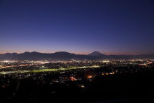 曽我別所という地区の山の斜面から町並みを見下ろしています。左の写真、小田原市街中心部の町明かりと 駿河湾、箱根・伊豆の山々。右の写真、中央に緑色に光っている部分はJRの車両基地です。奥に足柄方面 の山と富士山が見えます。小田原は海と山に囲まれた町であることが分かります。