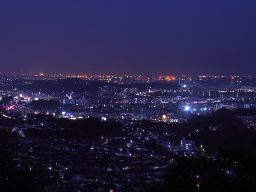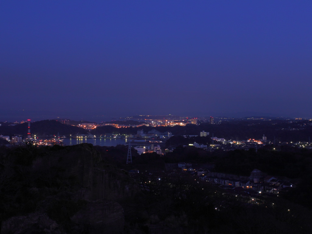 鷹取山は横須賀市北部にあります。住宅街の奥に山頂へ登る道があり頂上には簡単ながら展望台が あります。左上の写真に写っています。西側には富士山、北側は横浜みなとみらい付近が見えます。 肉眼では認識しづらいですが、東京タワーも写りました。横須賀市街方面は、大都市に比べると ほのぼの夜景といった感じです。