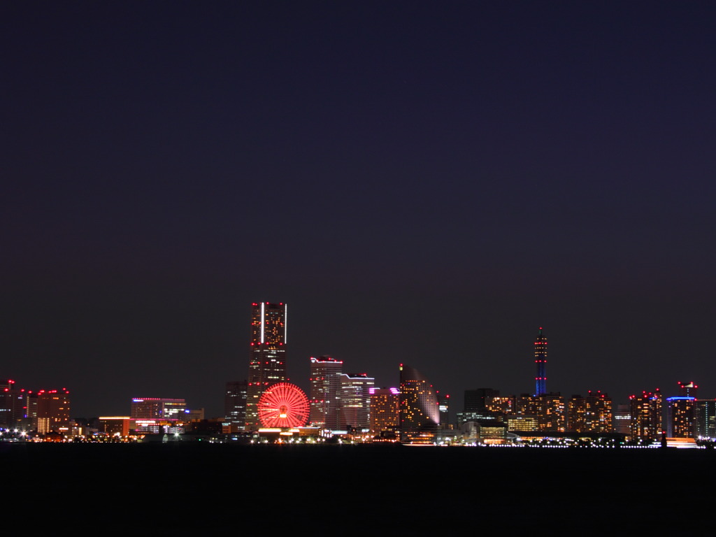 大黒大橋からです。平日だったのでビルの明かりが多めです。新型コロナウィルスで観光客が減っていますが、観光船が一隻通り過ぎました。 動いている船のブレを少なくするため、ISO感度を上げてシャッタースピードを短くしました。