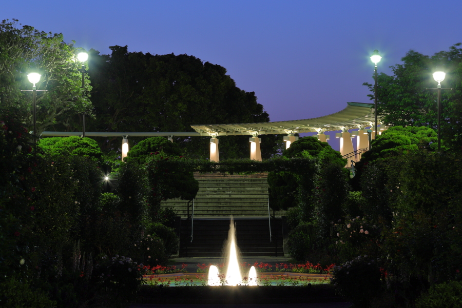 ゴールデンウィークということもあって多くの観光客がいましたが、陽が落ちて暗くなると人は少なくなりました。 バラの花が咲いていました。花は自分の照明器具で照らしています。ライトアップはされていません。 下段の写真は徒歩5分ほどの所にあるアメリカ山。たまたま催し物が行われていました。マリンタワーが奥に見えます。