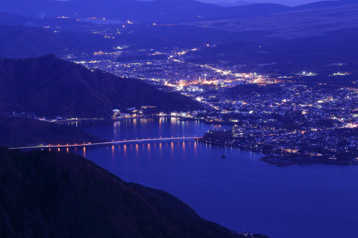 までずっと続いていました。写真は第2展望台、時刻は深夜0時前後です。右手前に木が入るのと、左側に河口湖大橋