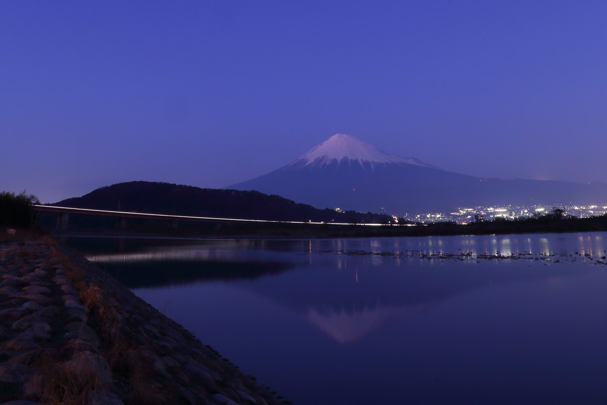 富士市を流れる富士川のほとりです。富士山と北極星が1枚の写真に入る場所を探し、ここに 行き当たりました。イメージしていた写真になりましたが、富士山が小さいので、もう少し 富士山の近くに良い場所がないかと思っています。川に逆さ富士が映ったのは意外でした。