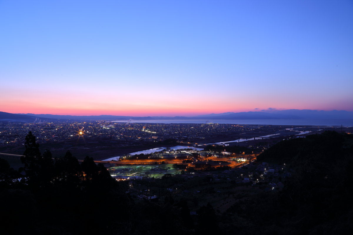 東名高速道路の富士川サービスエリア駐車場で撮った夜明けの写真です。手前は高速道路を通行する車の光と富士川。 その奥には富士市の町明かりと富士山、その右側の山は愛鷹山連峰です。高速道路を利用しなくてもサービスエリア を見物することができます。