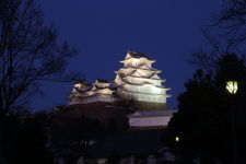 天守閣の前には大広場があります。各所を照らす照明がとても強く、天守閣などはすぐに白飛びしてしまいます。 真ん中下段の写真は石垣の上から見た姫路市の様子。大きな月が出てきたので良いアングルはないか探しましたが、 天守閣と一緒に撮れる場所は見つかりませんでした。