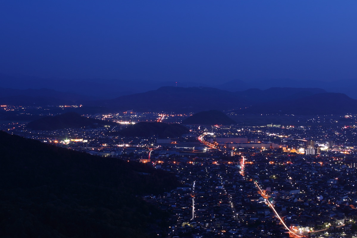 昔、山頂に城があった場所が今は広場になっています。山頂へ続く登山道は、ほとんど平坦部のない 階段状の坂になっています。きつい坂を上がった分、眼下に広がる素晴らしい眺望でした。右上の 写真、暗くなったので判別しにくいですが、海岸沿いに鳥取砂丘が見えました。日本海側に落ちる 夕日もきれいでしたが、写真で見ると卵の黄身のようです。今年に入ってから2回ツキノワグマが 登山道に現れたとのことで、撮影後は暗闇にペンライトを持ってビビリながら下山しました。