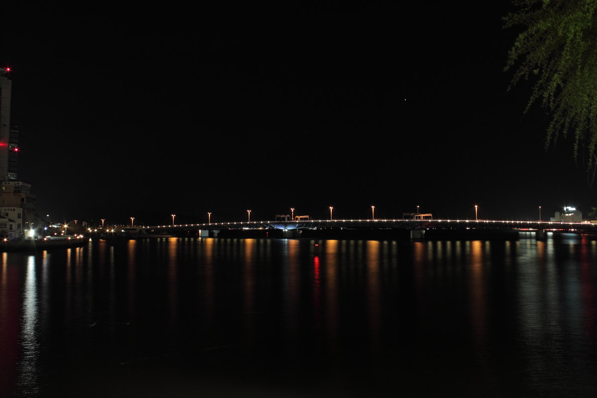 松江は字の通り川に囲まれた町なので、あちこちに橋があります。右の写真は宍道湖大橋です。橋の奥が 宍道湖です。夢中になって夜景撮影をしている時は空腹を感じないのですが、おしゃれな飲食店から良い においがしてお腹が鳴りました。