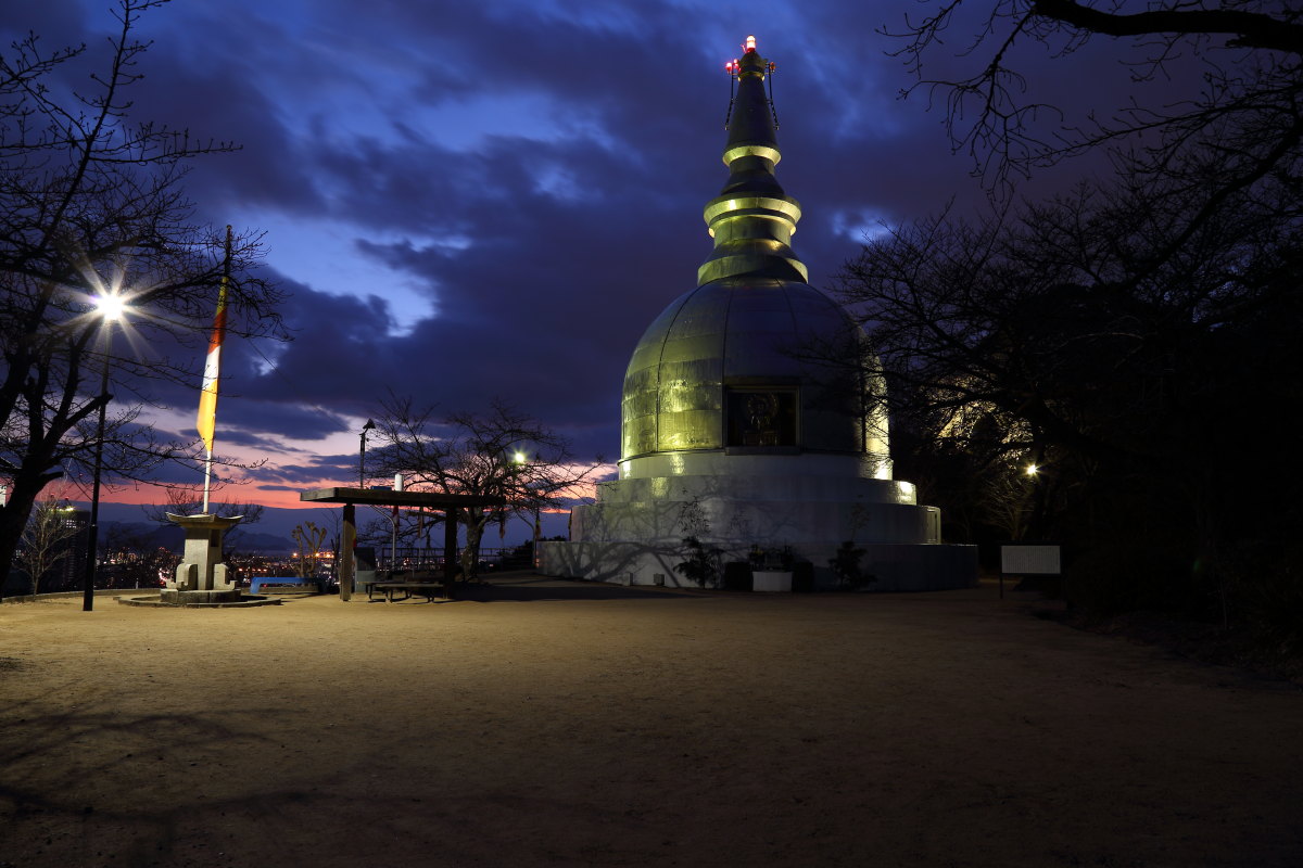 場所はJR広島駅のすぐ北側です。シンボルの塔が駅から見えます。街から近いので、建物それぞれを認識できます。 一番明かりの多い部分がJR広島駅です。駅前に高層ビルが建設されていて、ビックカメラが出店する看板が出て いました。奥には瀬戸内海と島々が見えます。この日は雲が多く迫力のある(?)画像になりました。