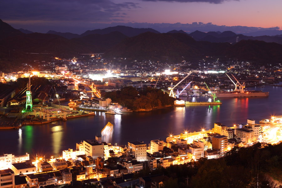 尾道の千光寺公園展望台の景色です。向島との間は川ではなく瀬戸内海の水道です。水道の手前が尾道駅と 市街地中心部です。造船所のクレーンがライトアップされています。毎週金曜、土曜、日曜にライトアップ されています。山、海、坂、寺、橋といった要素があり、色々な写真が撮れそうな町です。