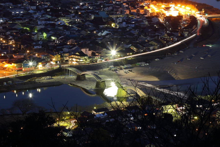 日が落ちるとまだ空が明るいうちから橋の投光器が点きました。背景の山にある岩国城の天守閣は完全に暗くなって からライトアップされました。橋の投光器が両岸で四方から強烈に光るので、投光器が橋に隠れて逆光を防ぐ角度を 選んで撮影するようにしました。初めて行ったのですが、この日は川の水が少なかったのかも知れません。下段真ん中の 写真、2019年1月撮影のデータに更新しました。