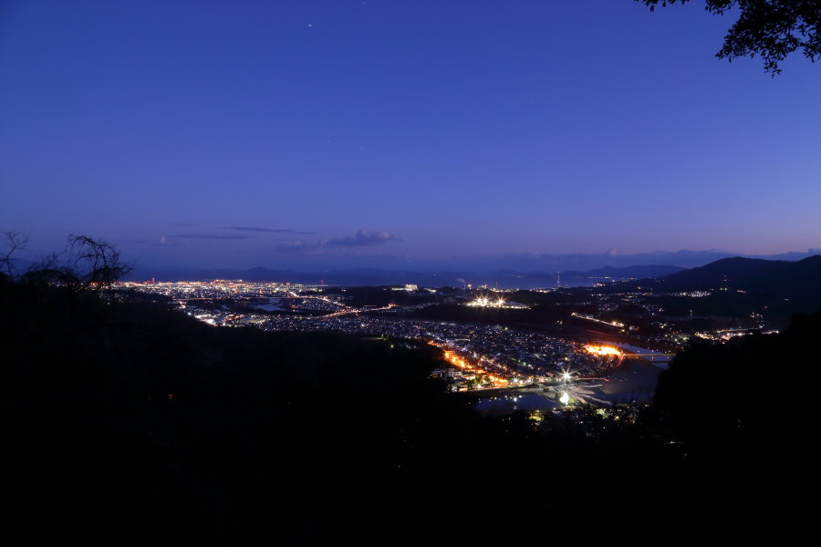 錦帯橋を見下ろす岩国城の前で写真を撮りました。城の前とロープウェイ山頂駅の隣が展望ポイントです。 南側の一方向のみ見えます。暖かい季節は葉が生い茂って視界がやや狭くなりそうです。光の多い部分は 岩国市中心部、奥には瀬戸内海が見えます。ここに限りませんが、展望台の前の木を大胆に伐採してくれる と景色が拡がって良いなぁと思います。