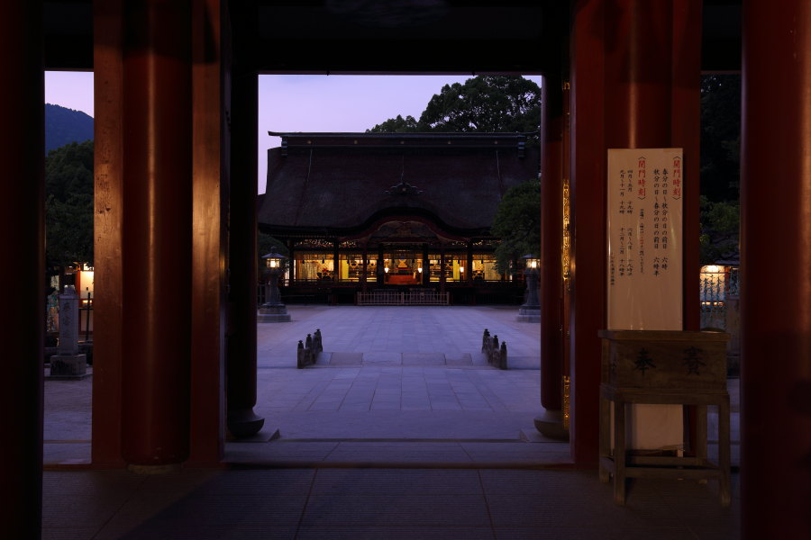 行ってみたら菊の花の展示会中でした。展示物があってうまく三脚が立てられないかと思いましたが、星の撮影では北極星の写る 角度が門のほぼ正面で問題ありませんでした。気温が10度を下回る寒い日でしたが、本を読むなどしながら2時間の撮影を しのぎました。月の明るい夜は空が青く写ります。紅葉のライトアップはたまたまでした。
