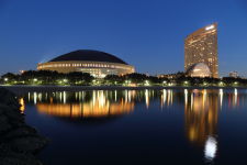 福岡ドームは海岸沿いにあります。金属系の屋根が照らされて、昼間はかなり遠くからも 認識できます。福岡ドームと福岡タワー、2つのシンボルが福岡らしい景色を作り出しています。