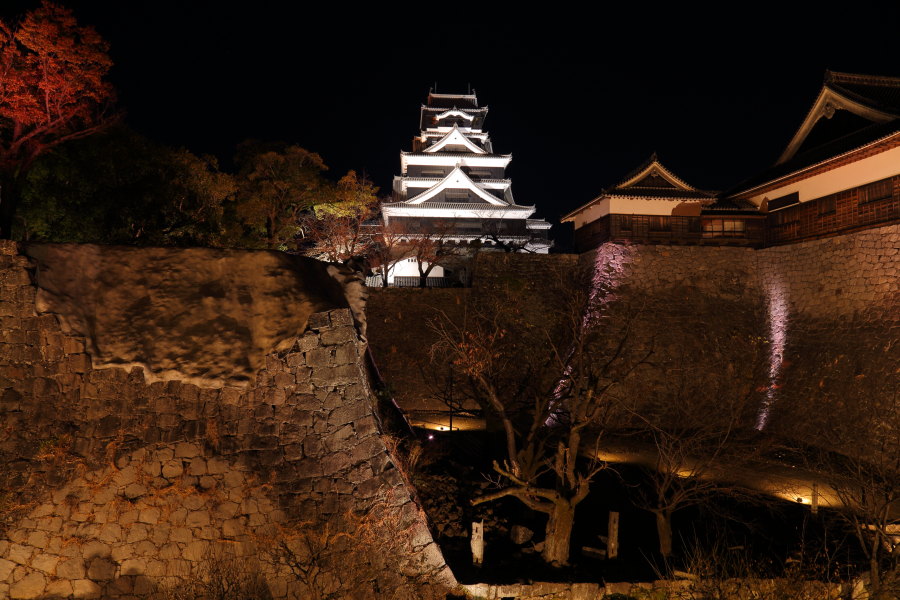 熊本城の近くにある旧細川刑部邸です。紅葉ライトアップのイベントが行われていました。入場無料なので 沢山の人が見物に訪れていました。長時間露光で人影は消えています。